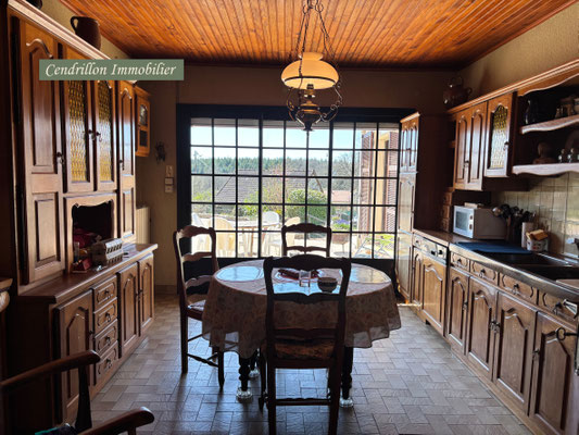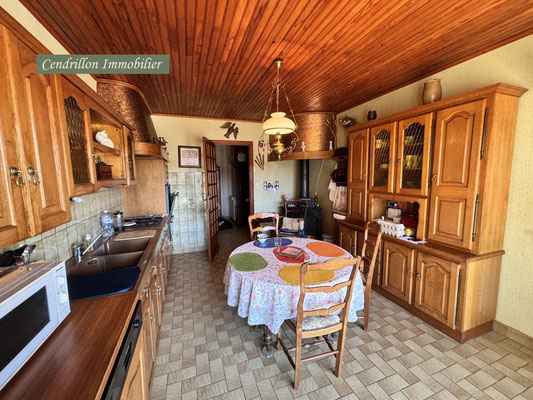 Cuisine : 3.4 x 4.5 = 15.6m2. Grande baie vitrée double vitrage huisseries aluminium donnant sur la terrasse. Cuisinière à bois.